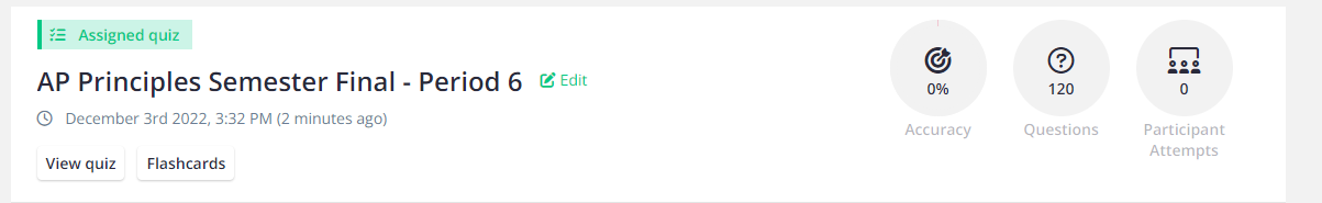 Due Date: Semester Final exam date 2022 Semester practice final exam practice (120 Questions) Click here and practice this Quizizz.