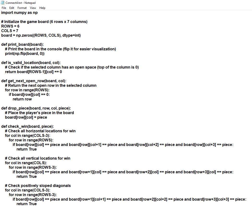 Connect 4 game. You will get a 100 if you can create this program with using only Pseudocode. If you have a copy of the complete program, You will get a grade of 70.Here's a basic Python program for a console-based Connect Four game. The game is played in a 6x7 grid, where players take turns dropping pieces into columns to form four in a row horizontally, vertically, or diagonally. This code includes functions to create the board, place pieces, and check for win conditions. Here's a basic Python program for a console based Connect Four game. The game is played in a 6x7 grid, where players take turns dropping pieces into columns to form four in a row horizontally, vertically, or diagonally. How to Play: 1. Start the game by running the code. 2. Players take turns choosing a column to drop their piece into by entering a number from 0 to 6. 3. The game ends if: o A player connects four in a row, either horizontally, vertically, or diagonally. o The board is full, resulting in a draw. You can expand on this game by adding additional features like AI for a single-player mode or visual improvements using libraries like pygame. Connect Four Game Pseudocode ************************ Initialize constants: ROWS = 6 COLS = 7 Initialize a 6x7 game board with empty cells (0s) Define function print_board(board): Print the board to the console (flipped vertically) Define function is_valid_location(board, col): Return True if the top cell in the selected column is empty (0), otherwise False Define function get_next_open_row(board, col): For each row from top to bottom: If the cell in that row and column is empty (0): Return the row index Define function drop_piece(board, row, col, piece): Place the piece in the specified row and column of the board Define function check_win(board, piece): For each possible starting location in the board: Check for horizontal, vertical, and diagonal four-in-a-row for the given piece If a four-in-a-row is found, return True Return False if no four-in-a-row is found Define function connect_four(): Set game_over = False Set turn = 0 Print the initial board While game_over is False: If turn is even (Player 1's turn): Set piece = 1 Display "Player 1's turn" Else (Player 2's turn): Set piece = 2 Display "Player 2's turn" Prompt the player to choose a column (0 to 6) If chosen column is valid (is_valid_location(board, col)): Find the next open row in the selected column (get_next_open_row) Place the piece in that row and column (drop_piece) If this move results in a win (check_win(board, piece)): Print the board Display "Player {piece} wins!" Set game_over = True Print the current board Increment turn by 1 Else: Display "Column full. Choose another column." If the board is completely filled and no winner is found: Display "The game is a draw!" Set game_over = True Run the connect_four() function to start the game ****************** Click here for the first half of the Python solution. Required files: • PX_lastname_Connect4.py (Python code) • PX_lastname_Connect4.png (Screenshot of output) • PX_lastname_Connect4.mp4 (Video of running program) Submit all files to Google Classroom.