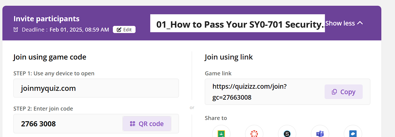 Please watch this video. How to Pass Your SY0-701 Security+ Exam - Click here. If the link above does not work, copy and paste the URL on the next line into the chrome address line. https://youtu.be/KiEptGbnEBc?si=iz9Ci_cGETZiQOd2 Practice the Flash Cards – Click on the link. If the link above does not work, copy and paste the URL on the next line into the chrome address line. https://quizizz.com/join?gc=37952160 Practice this Quizizz to be prepared for your Exam 01_How to Pass Your SY0-701 Security+ Exam – Click here. If the link above does not work, copy and paste the URL on the next line into the chrome address line. https://quizizz.com/join?gc=27663008