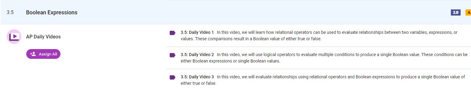 3.5: Daily Video 3 In this video, we will evaluate relationships using relational operators and Boolean expressions to produce a single Boolean value of either true or false.