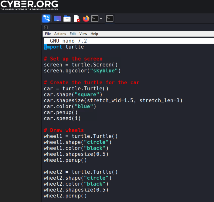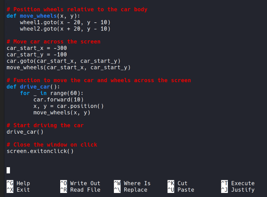 -Car Body: A turtle object is created to represent the car, which is a blue square stretched into a rectangle.