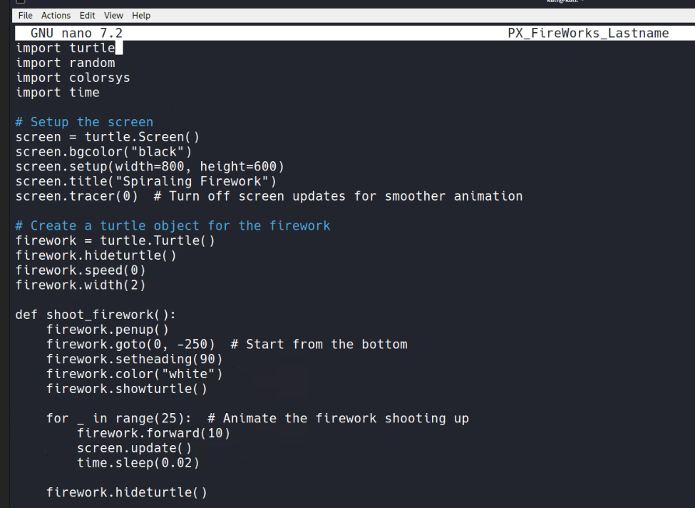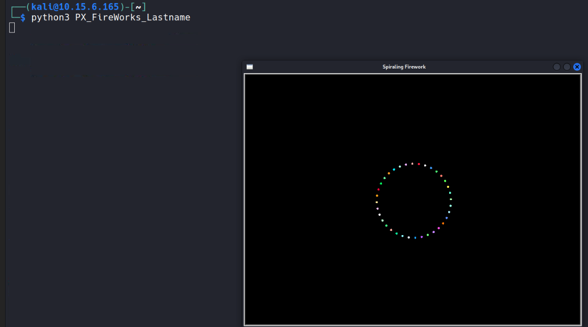 PX_FireWorks_lastname.png (Screen Print of the python program in the Kali)