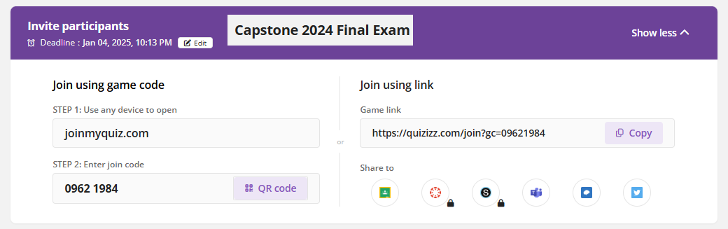 Capstone 2024 Final Exam If the link above does not work, copy and paste the URL on the next line into the chrome address line. https://quizizz.com/join?gc=09621984
