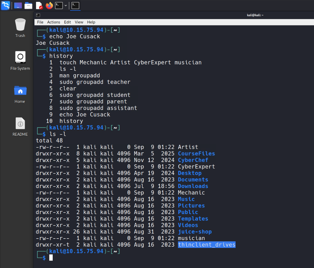 clear, thenls -land set group ownership:sudo chown "lastname":student Artistsudo chown jack:parent Mechanicsudo chown maddy:assistant musicianls -l